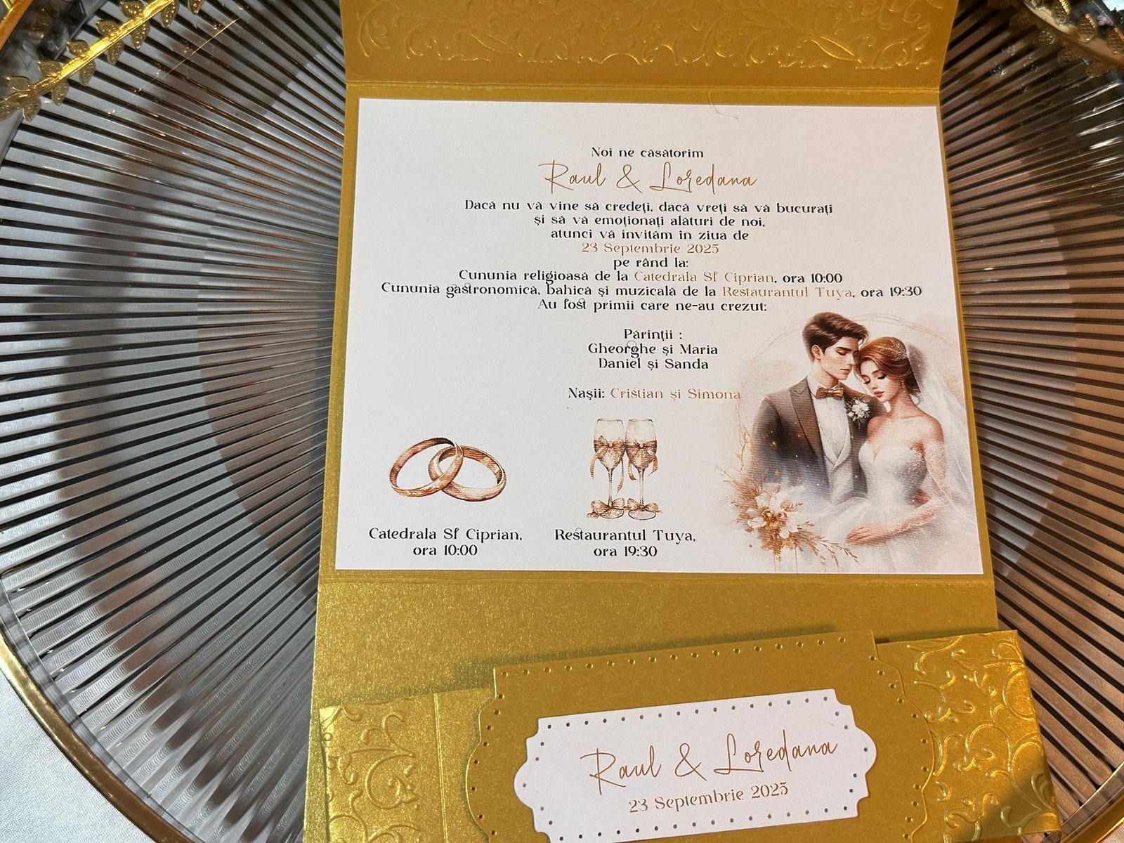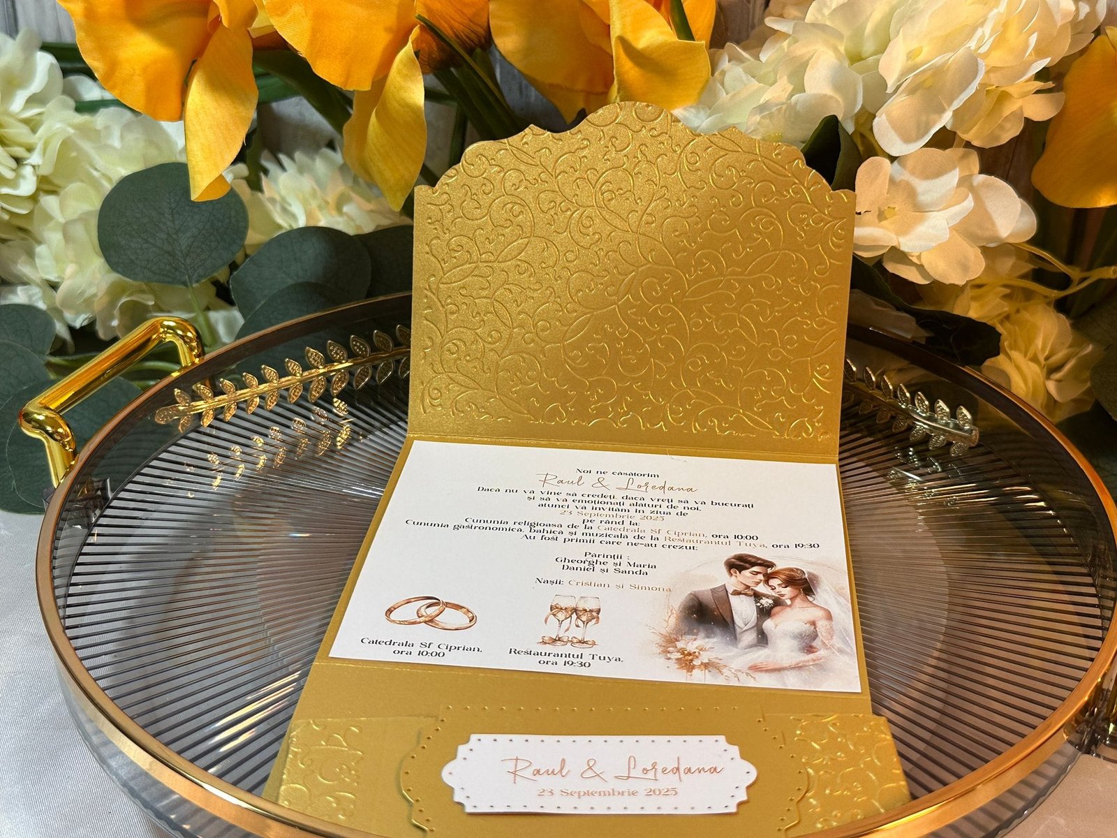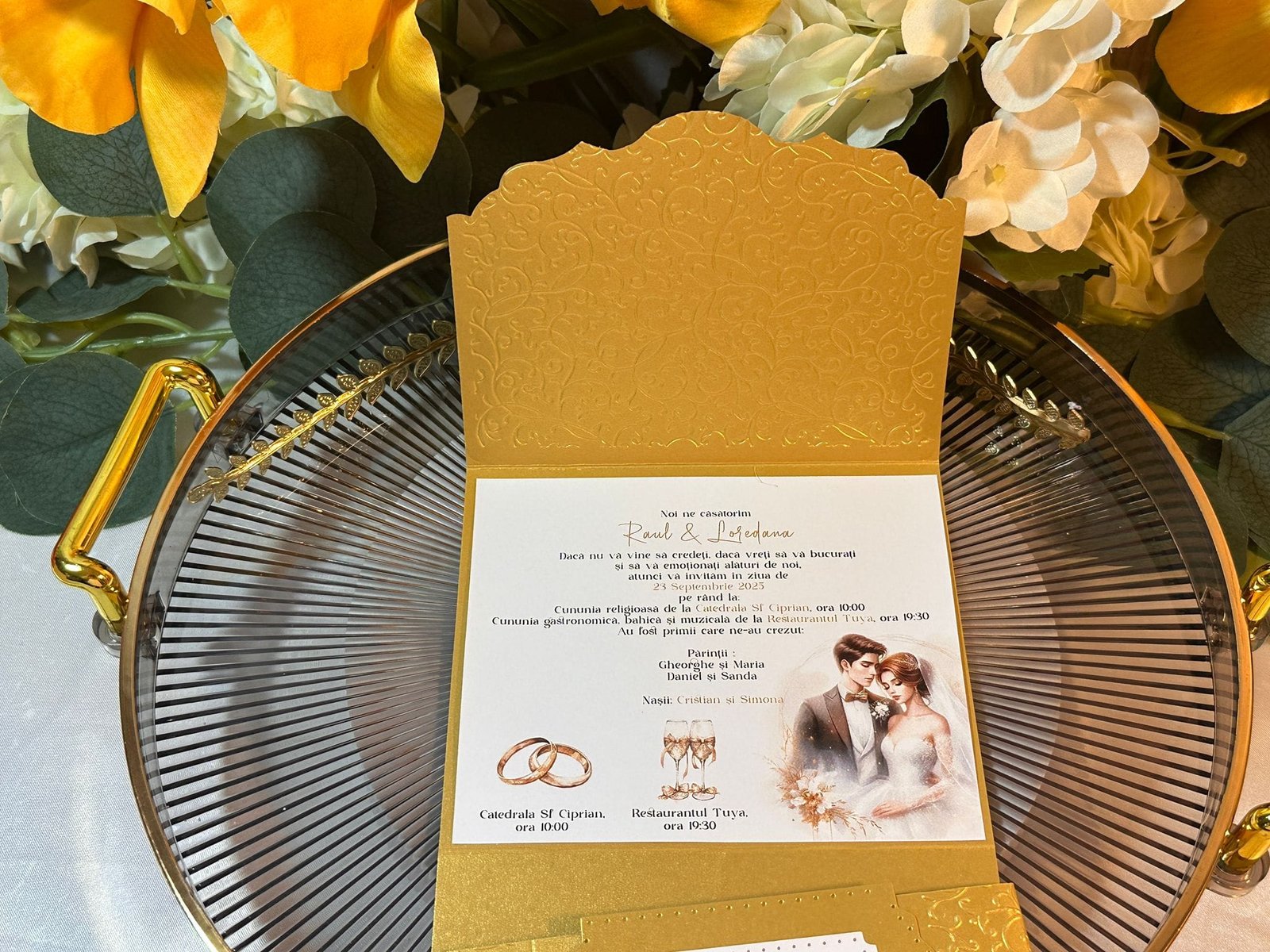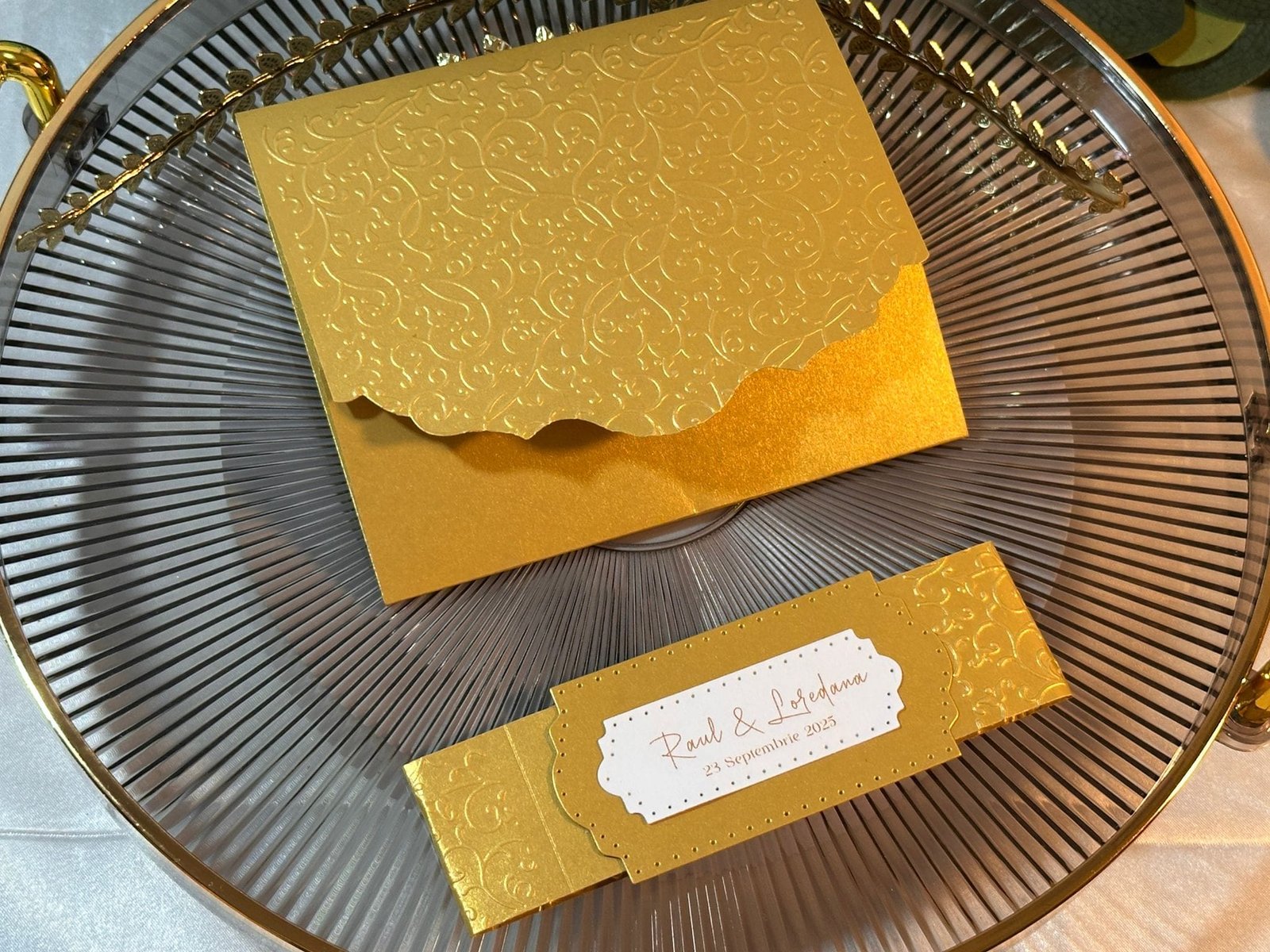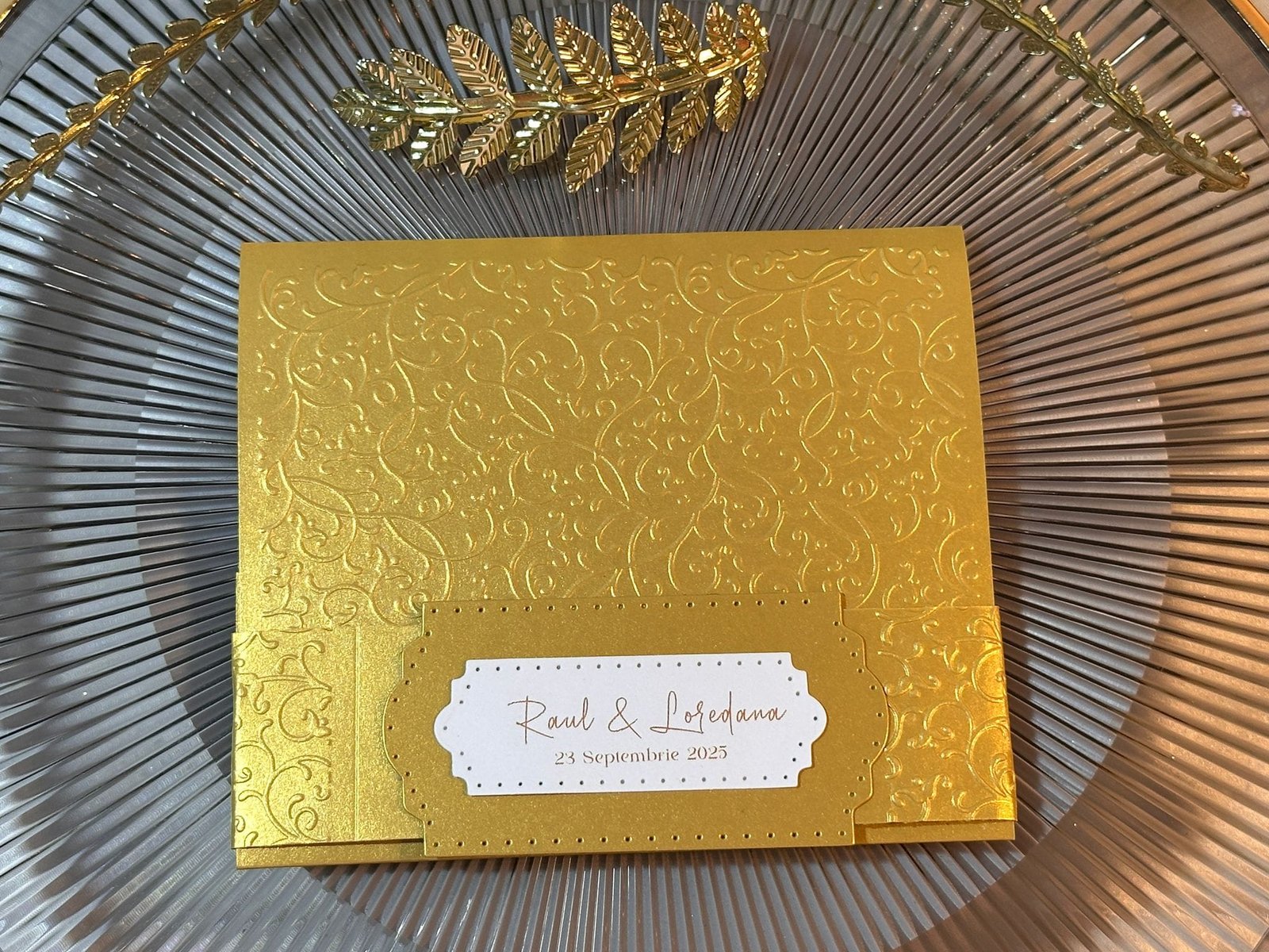 Invitație de nuntă luxoasă din carton sidefat auriu