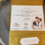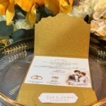 Luxurious gold pearlescent wedding invitation with embossed pattern and personalized text