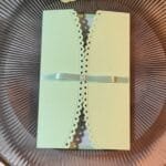 Invitație de nuntă verde mentă cu margini decupate și panglică satinatată – design romantic