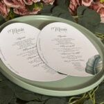 Meniu personalizat pentru nuntă în formă ovală, realizat pe carton premium de calitate superioară, cu design elegant și grafică florală în nuanțe verzi și pastel. Ideal pentru evenimente speciale precum nunți, botezuri sau aniversări, acest meniu adaugă un plus de rafinament meselor festive. Personalizat cu numele mirilor și data evenimentului, este tipărit cu text clar și ușor de citit, oferind invitaților o experiență deosebită.