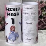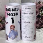 Meniul pentru botez poate fi personalizat de la zero cu numele bebelușului și un citat de familie, se poate combina ca fiind 2 în 1, meniu și număr de masă.