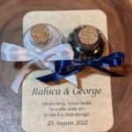 Set elegant de mărturii de nuntă “Sare și Piper”, format din două borcănașe din sticlă cu dop de plută, umplute cu sare și boabe de piper negru. Fiecare borcănel este decorat cu fundițe din satin alb și bleumarin, așezate pe un suport personalizat cu numele mirilor, data evenimentului și un mesaj romantic. Un cadou practic și simbolic pentru invitați, ce transmite ideea de echilibru și condiment în viața de cuplu.