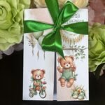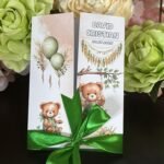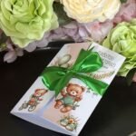 Green bear baptism invitation with satin bow